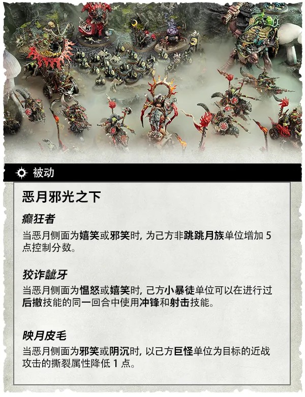 巨怪的映月皮毛會當惡月側面處於「邪笑」或「陰沉」時變得更為堅韌。因此,你或許希望在戰鬥開始時,選擇惡月展現出勝利的笑臉,以確保在前兩個戰鬥輪次中得到額外的保護,以抵禦那些想要發起近身作戰的敵軍。這些選項為精明的指揮官提供了豐富的戰術思路和軍隊組成的方式。