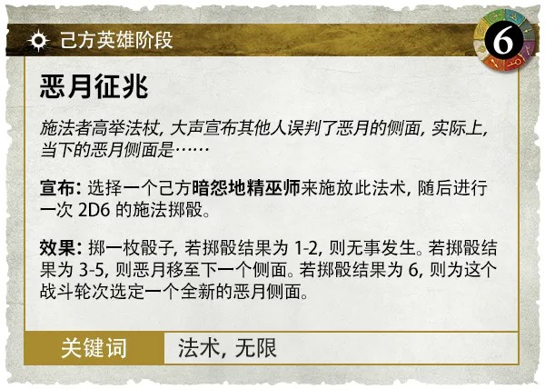 在惡月的邪光之下,這些瘋狂的地精薩滿和神秘學者從全新的惡月光輝中獲得了頓悟,並且在咀嚼了一些靈感蘑菇後,重新編寫了《濕冷學識》,以適應惡月的情緒變化。「惡月徵兆」取代了「暗中分神」,賦予了施法者一次額外的機會,通過一次 D6擲骰來決定惡月所呈現的側面。當擲骰結果為 3-5 時,惡月會移動至下一個側面,而當擲骰結果為 6 時,施法者可以精確地指定惡月的側面。同時,狂王斯卡格羅特也改變了他的祈禱方式,要求惡月保持固定的側面,而非延緩其變化。這使得指揮官在戰術上有了更多的靈活性,可以更好的利用惡月的側面來增強軍隊的戰鬥力。