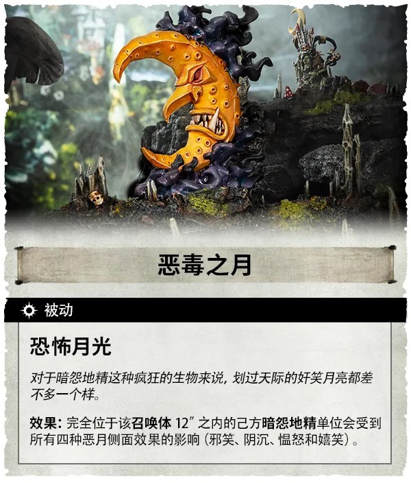 當暗怨地精們不想遵循惡月側面的變化節奏時,他們會召喚來自黯濕召喚體中的惡毒之月。這個強大的法術召喚體會在戰場上創造出一個12" 範圍的恐怖月光,使得完全處於該區域內的所有暗怨地精單位同時受到所有四種惡月側面效果的影響。這使得暗怨地精的軍隊能夠在瞬間獲得惡月側面的所有增益效果,極大地提升了戰術靈活性。