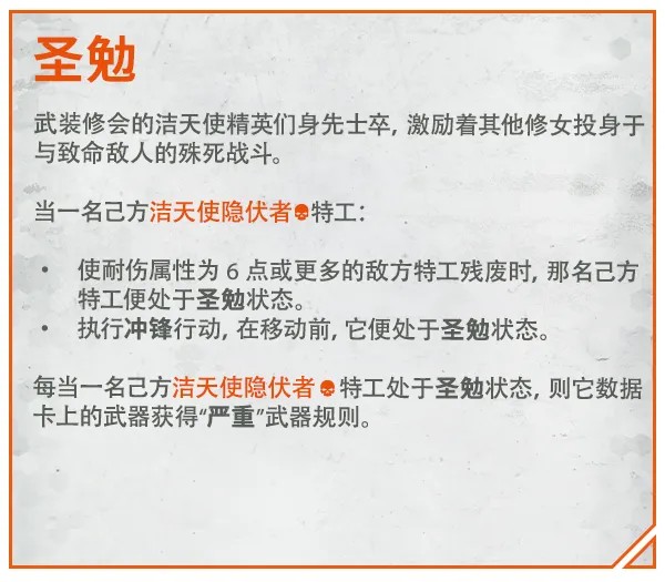 每支殺戮小隊都會獲得一種特殊技能,有些甚至能有兩種,但隱伏者強到直接獲得了三種,哪怕其中一種技能只對具有靈能的對手生效。首先,只要你的特工冒死衝鋒,或把值得他們出手的敵人擊倒,就能處於聖勉狀態,屆時他們所有武器都將附帶「嚴重」規則*。