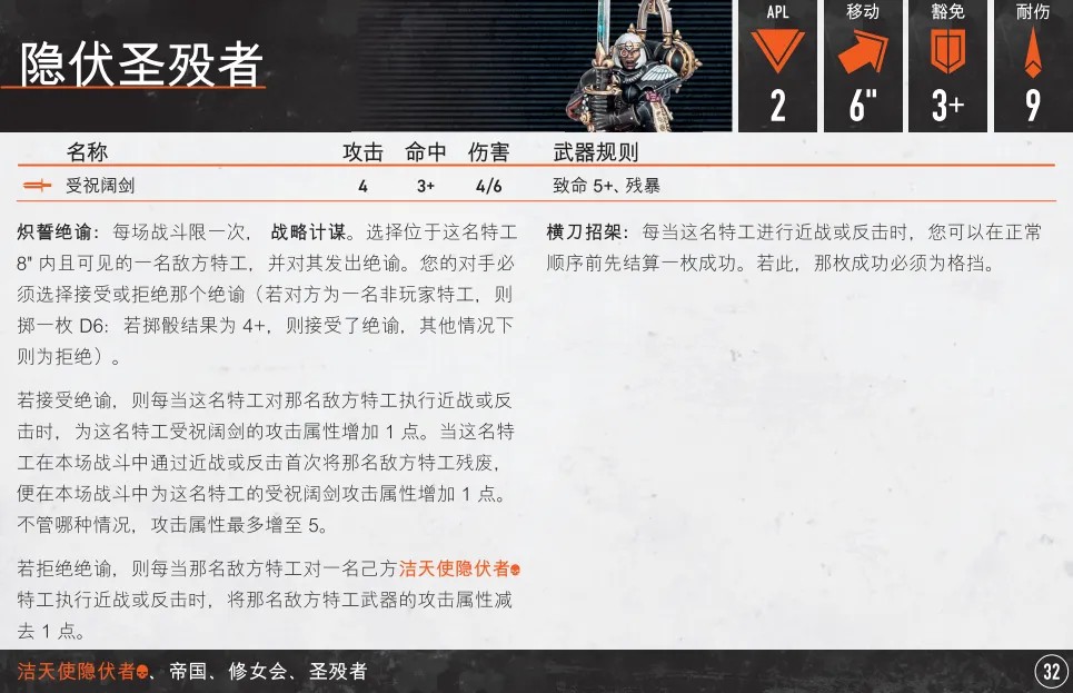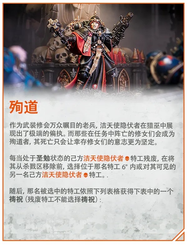 多謝二位的觀點!緊密抱團、在近戰中粉碎敵人,正是潔天使隱伏者報名參戰的初衷,所以她們帶來了一整套頂級近戰武器與短程槍械。其中,沒人比隱伏聖歿者更渴望把敵人的腦袋剁下來,她懷著如此狂熱的信仰自信,針對性地向任何目標發起單挑,並對那些怯戰退縮的懦夫報以惡毒嘲諷。