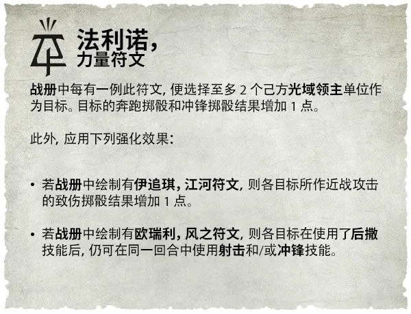 第四個戰鬥輪次,我將法利諾,力量符文,繪製於我的戰冊之上。由於這是本場戰鬥中首次繪製此符文,僅有兩個友方單位可獲得其效果。然而,法利諾可與伊追淇及歐瑞利產生共鳴,激發出更為強大的效果。