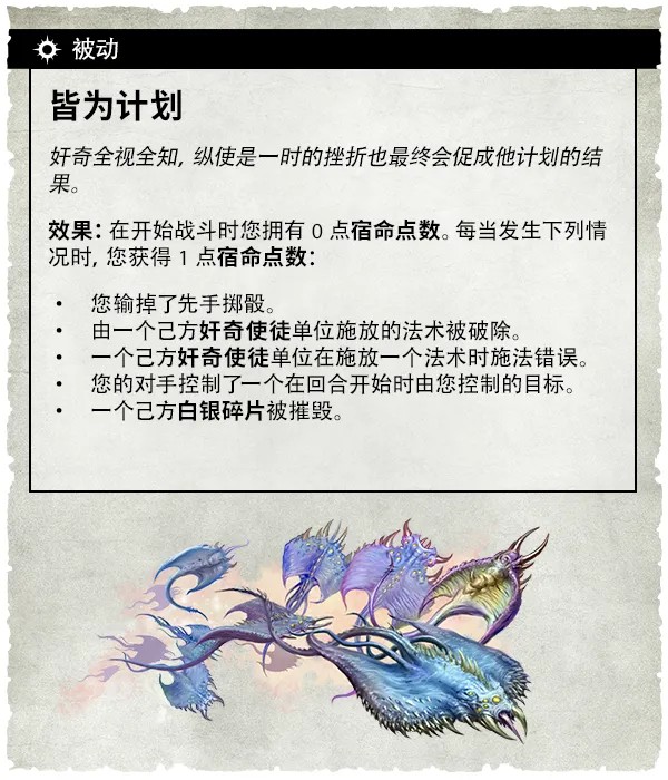 無論奸奇的軍隊遭遇何種變故,這位詭變之神始終致力於長遠佈局,一切皆為計畫。當你輸掉了先手擲骰、施法錯誤或法術被破除、失去目標的控制,或是你的白銀碎片被摧毀時,你都會獲得一個宿命點數。