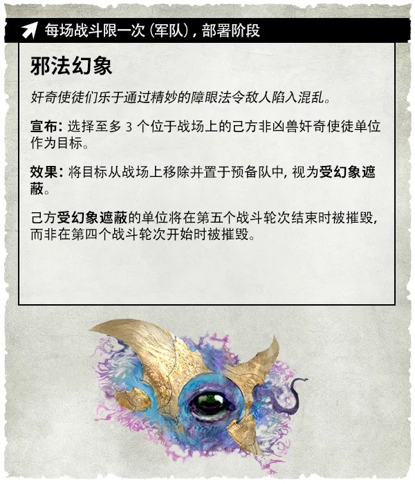 奸奇的帽子上又添了一根虹彩新羽,賦予追隨者幻象之力的技能。通過編織邪法幻象,戰場上最多三個非凶獸單位可被移除並置入預備隊,受幻象遮蔽。與常規預備隊不同,這些單位直到第五個戰鬥輪次結束時才會被摧毀,為你爭取更多時間來策劃臨場變陣。