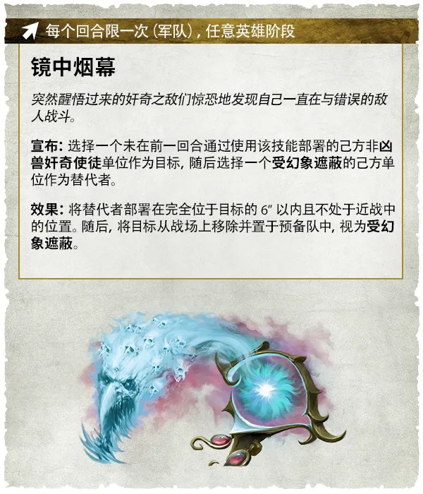 然而,你的欺瞞之力並非毫無限制,你無法用此技能將上回合通過鏡中煙幕部署的單位再次置換,也不能用它直接進入戰鬥。你需要挖掘思維中最具奸奇特質的那些部分,才能充分發揮這項靈活能力的潛力。