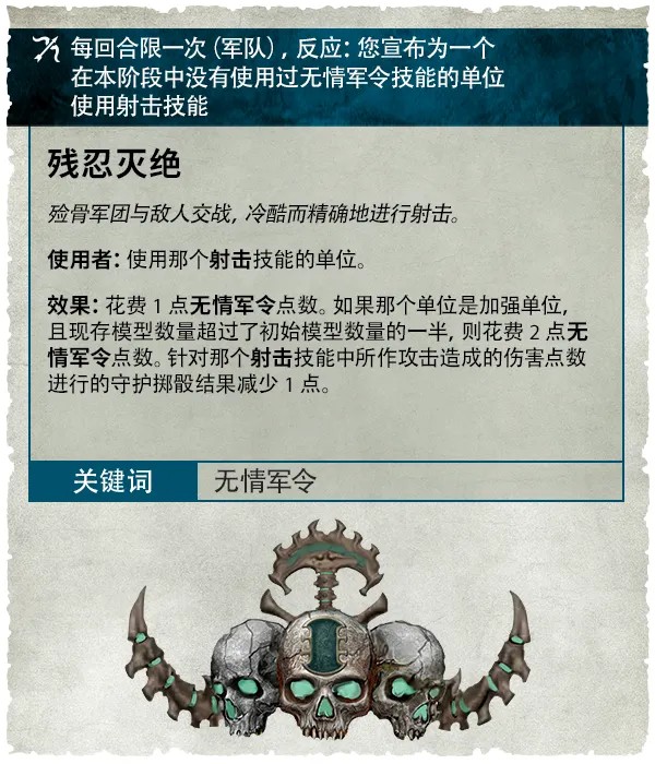 殮骨骸軍戰爭機器的精密聯動由一支不朽精英指揮,確保殮骨軍團的戰士們以完美的協同作戰。在每個戰鬥輪次中,你的一位英雄可根據其軍階生成一定數量的無情軍令點數:卡塔克羅斯,墓城死亡大君生成10點,騎戰駒或乘戰車的骨騎統領生成6點,而冥儀骨匠生成2點。隨後,你可在整個戰鬥輪次中消耗這些點數來施展各種無情軍令技能,任何未使用的點數都會如墓沙般從指間流逝。