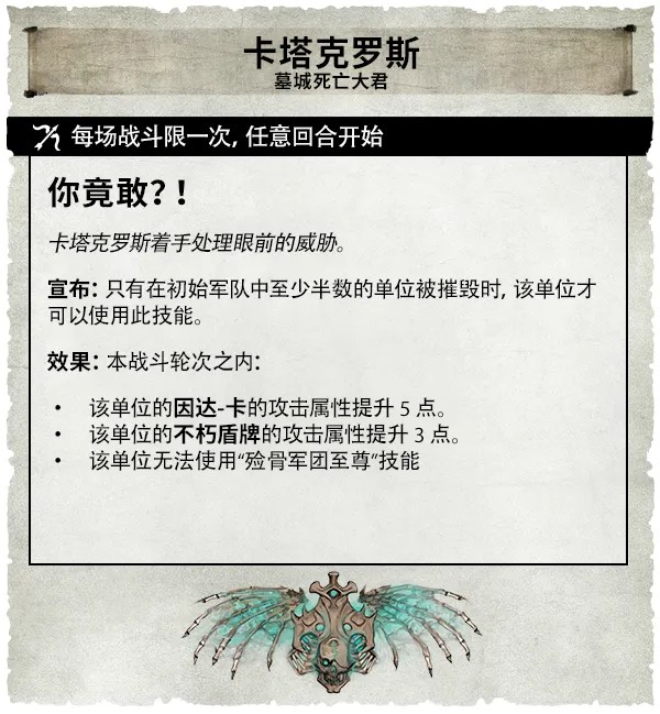 儘管卡塔克羅斯偏愛在遠處運籌帷幄、掌控戰局的起伏,但若局勢對殮骨軍團不利,即你初始軍隊中至少有半數單位被摧毀,卡塔克羅斯將怒吼「你竟敢?!」,並親自認真對待敵人。他的狂怒令灌注了暴擊(2 次命中)效果的因達-卡的攻擊屬性從3提升至8,同時不朽盾牌的攻擊屬性從3提升至6,但這也會讓這位原本沉著冷靜的指揮官陷入近身混戰,無法繼續使用殮骨軍團至尊技能。