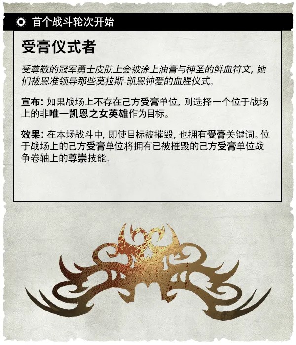 無論你正調遣的是第一位還是第四位受膏勇士,是時候開始鮮血儀式了。和所有最棒的派對一樣,最重要的兩件事是誰來主持,以及在哪裡舉行。如果你選定的勇士灑下敵方鮮血(或他們自己的鮮血被灑下),又或者你在特定地點製造了屠殺,恭喜你,你已經完成了鮮血儀式。