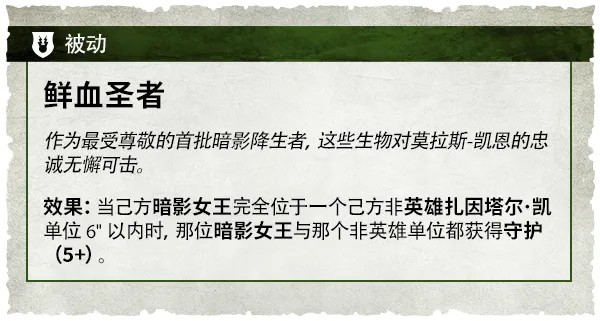 該軍隊可包含鐵鱗蛇女、鮮血姐妹、鮮血追獵者、翼女撕心者、翼女奪命者、血骸美杜莎及血骸神龕,但必須由莫拉斯-凱恩與暗影女王共同領軍。在位期間,莫拉斯可施展黑暗魅力,令卑賤生物在她面前徒勞掙扎、無所適從。