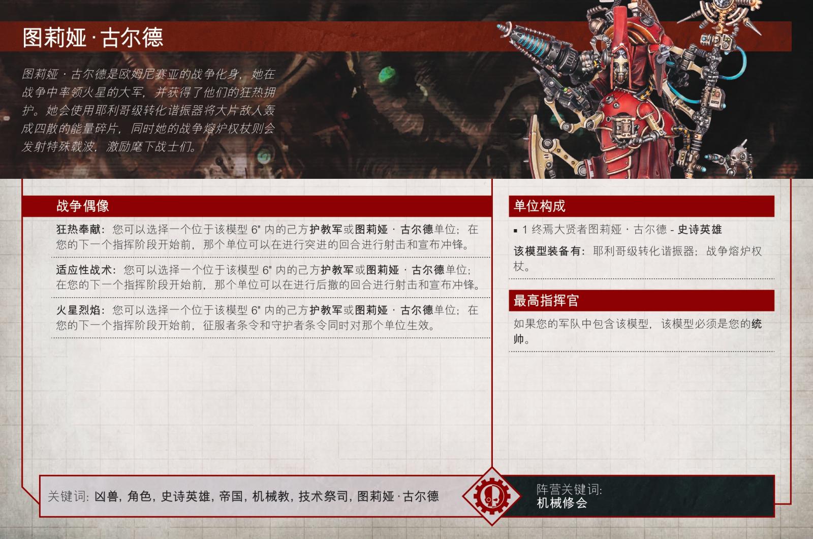 作為火星的終焉大賢者以及還原修會的老兵,圖莉婭.古爾德的一切都與一件事有關:毀滅。她高度增強的身體與傳奇的貝利薩留斯.考爾一樣耐用,而她的武器可以輕鬆地在極其強韌的異教徒身上打出洞來。