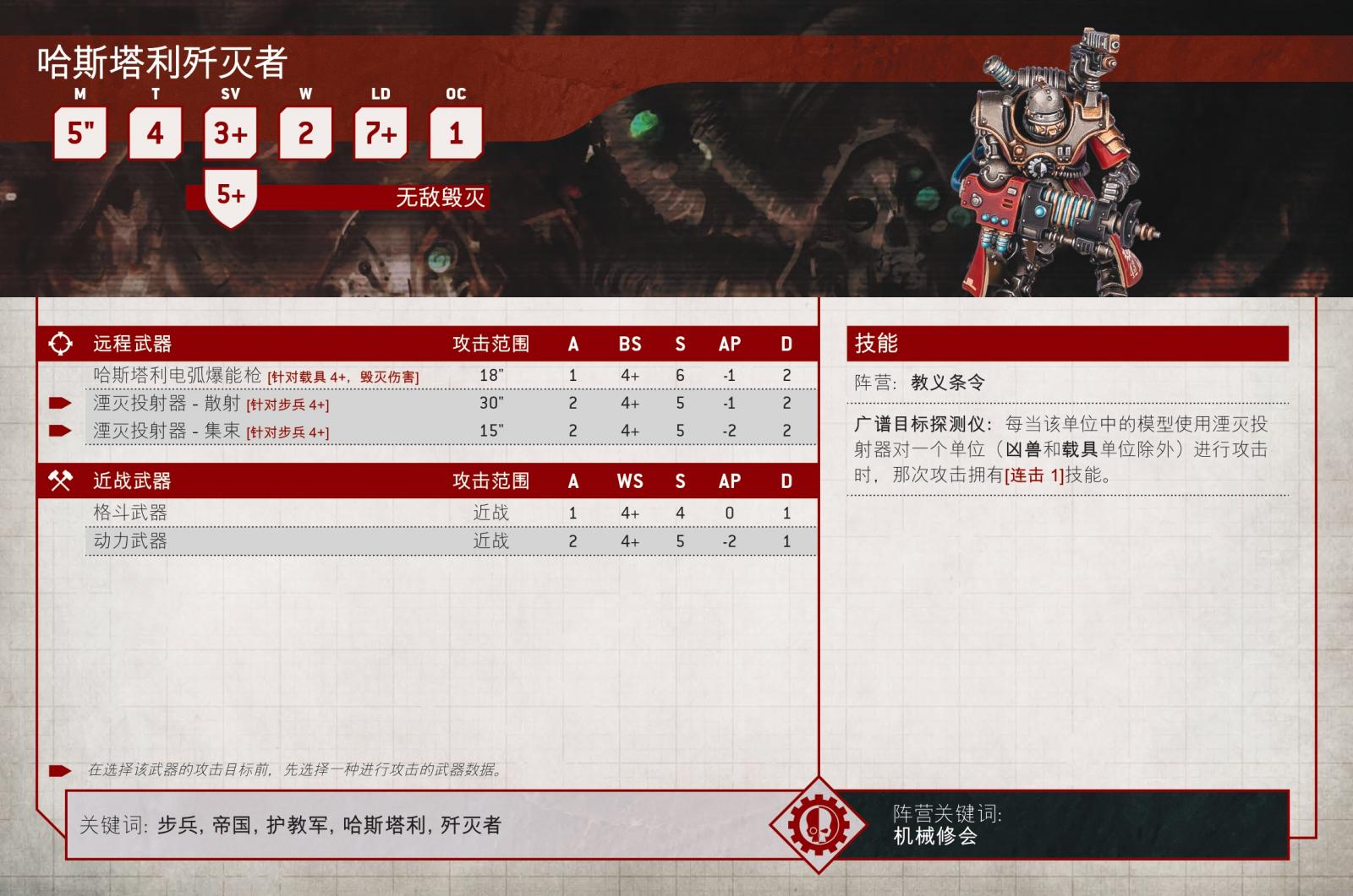 由古爾德帶領防禦鑄造世界阿格里皮納、裝備重型武器與裝甲的哈斯塔利,是護教軍軍團非常需要的火力支援單位,能夠在吸收回擊火力的同時在遠程造成大量傷害。他們可以作為兩種單位之一上場,殲擊者或燧發槍手,前者擅長清除步兵,而後者則專注於將載具和凶物炸成碎片。
