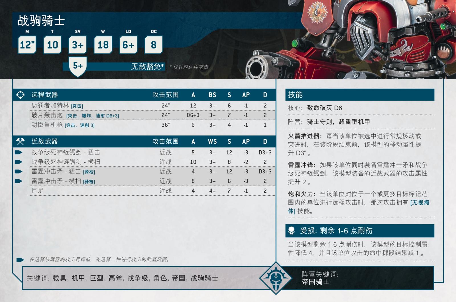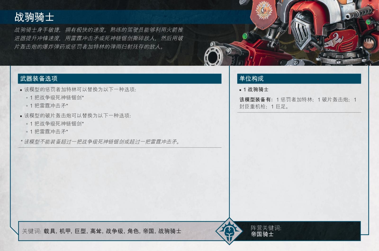 當機械修會專注於堅固的防禦線時,靈活的戰爭級帝國騎士則在側翼衝鋒,尋找光榮的目標進行刺殺。戰駒騎士與侍從一樣快,而他們的「火箭推進器」在他們令人印象深刻的速度之上提供了額外的爆發速度。