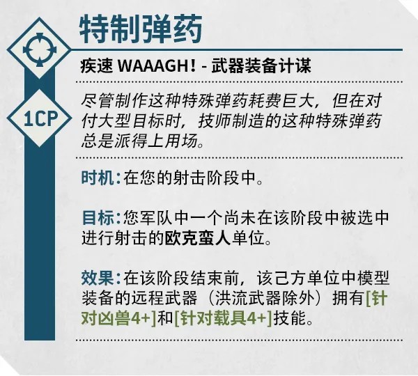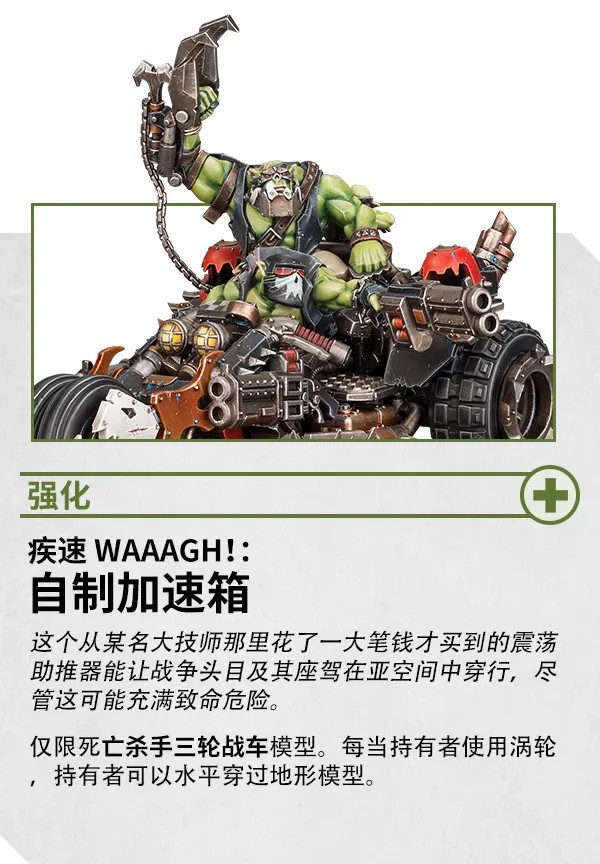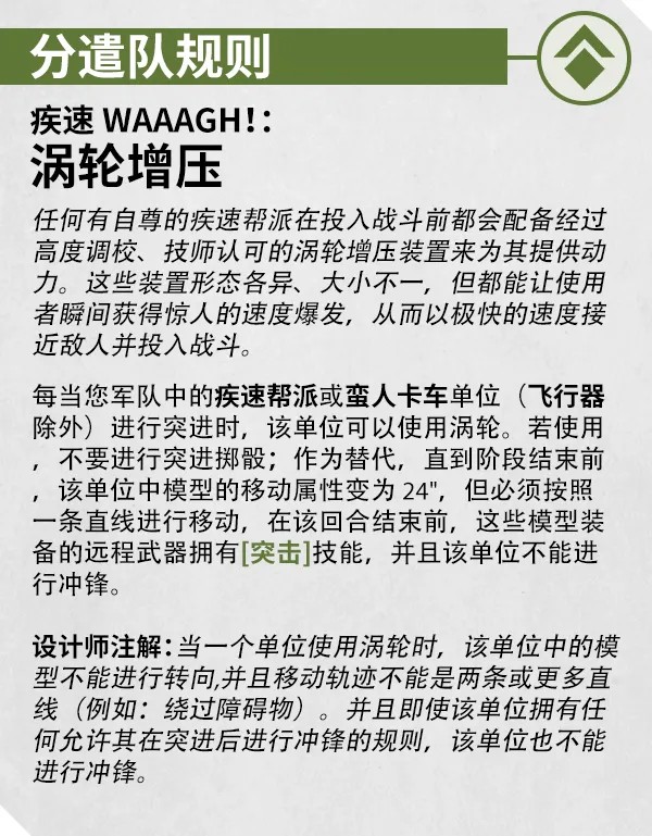 疾速WAAAGH!以一條分遣隊規則轟鳴登場,完美詮釋了他們對速度的瘋狂執念。啟動渦輪增壓裝置,向前猛衝24英吋,但有一個致命缺陷:你必須沿一條筆直的直線前進,不能轉向,也不能偏移,因為你的小子們只顧著死命抓緊保命,根本騰不出手來操控方向。