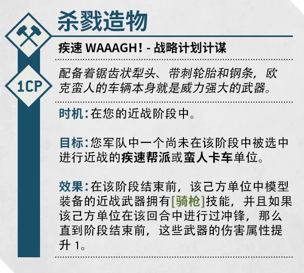 要是到了終點卻還揍不扁那些人類雜碎,全世界最快的速度也幫不了你,而這個分遣隊的計謀中恰好有幾個誘人的選擇。殺戮造物最適合用來猛衝星際戰士戰線和其他擁有2點耐傷的單位,因為你那些本就兇悍的歐克蠻人戰士能打出至關重要的2點傷害這一最佳數值,這意味著許多常見的肉盾型敵人在試圖通過消耗戰擊敗他們之前,都得三思而後行。