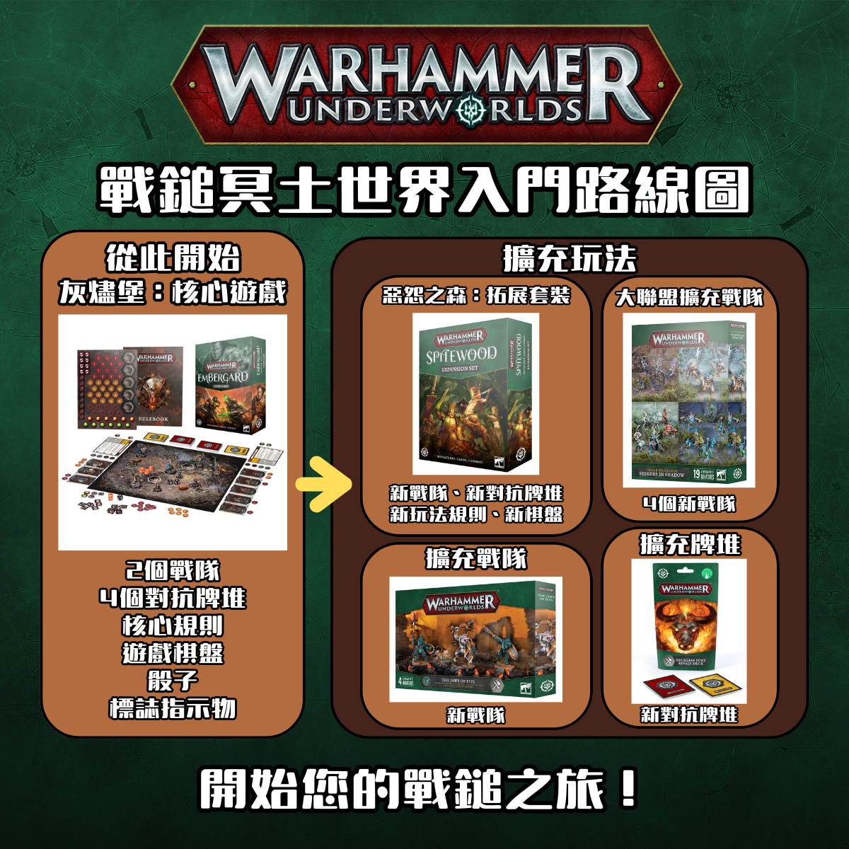 透過《戰鎚冥土世界:灰燼堡》核心套裝,您可以遊玩無數場的《戰鎚冥土世界》遊戲。當您準備好更進一步時,您還可以用一系列擴展包,例如新戰隊和新的對抗牌堆,創造更不一樣的遊戲體驗。
